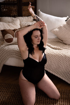 Meet a breathtaking boudoir model who seamlessly combines elegance and allure. Her striking aesthetic varies from implied nudity to stylish bodysuits, featuring a delicate white lace design that beautifully accentuates her figure. With her artistic tattoos, she radiates confidence. In one captivating photo, she exudes a relaxed vibe while reading a book in her lingerie, drawing you into her intimate space.